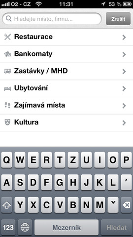 - Restaurace, bankomaty, ubytování, úřady atp. v místě, kde se nacházíte