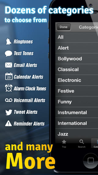 - Desítky tematických kategorií: legračních zvuků, hity, vánoční tóny, Hip-Hop, Rock a mnoho dalšího!