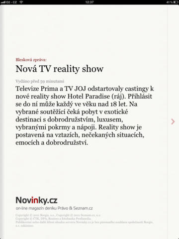 Seznam.cz představuje jednoduchou aplikaci Novinky.cz pro Váš iPhone. Stačí ji jen pustit a jedním prstem listovat v článcích. Znáte to. Jedete do práce nebo třeba na schůzku a máte chvíli čas. Pár minut, tak akorát rychle mrknout, co je nového. Když jsme přemýšleli o Novinkách pro iPhone, měli jsme tuto běžnou situaci na mysli.