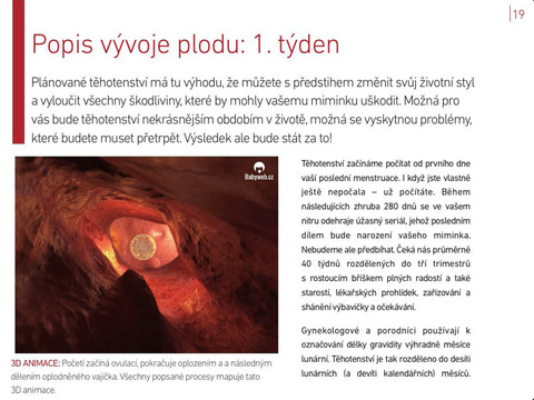 Ještě nikdy nebyla naučná encyklopedie popisující těhotenství tak vzrušující a zábavná. První elektronická multimediální kniha o těhotenství vznikla ve spolupráci s předním českým webem o mateřství a rodičovství Babyweb.cz, lékaři a dalšími odborníky. Uvidíte i uslyšíte jedinečný a fascinující příběh vývoje miminka od početí až po konečnou fázi jeho vývoje.