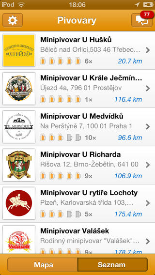 - zobrazení aktuální polohy a vzdáleností jednotlivých pivovarů,