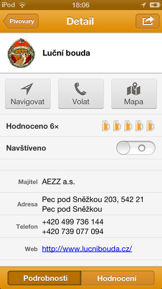 - detailní informace o pivovaru s možností kontaktování přímo z telefonu,