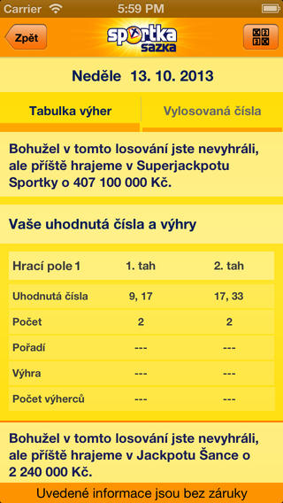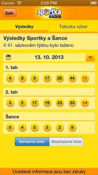 V aplikaci SAZKA si můžete kdykoli ověřit výsledky slosování všech našich her. Kromě oblíbených her Sportka, Euromiliony a Šťastných 10, zde naleznete i výsledky her Keno, Kostky, Kasička a hry Sazka.