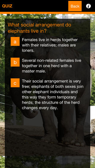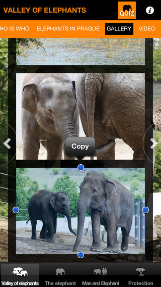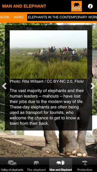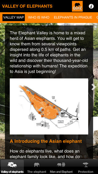 Mobilní aplikace toho však umí daleko více! Představí vám celý chov slonů v Zoo Praha, jejich způsob života, rozmnožování atd. V sekci „Člověk a slon“ se dozvíte zajímavosti o úloze slonů v náboženství a obřadech. Poznáte, jak vypadá život slonů v moderní době a poučíte se o způsobech jejich ochrany. Nabyté poznatky si můžete ověřit formou zábavného kvízu.