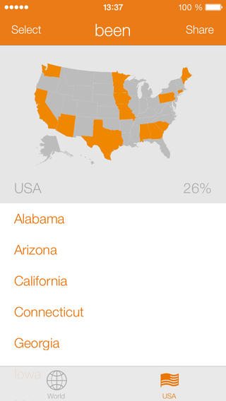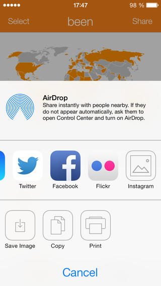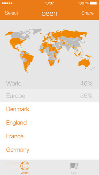 Been je jednoduchá aplikace, která vám ukáže, kolik % světa jste už navštívili. Vyberete si z nabídky celého světa země, které jste navšítívili, ty se zobrazí na mapě a ihned vidíte, kolik % světa jste už viděli. Svoji mapu navštívených zemí můžete samozřejmě sdílet na Facebook, Twitter, Flickr, Mail nebo Instagram.