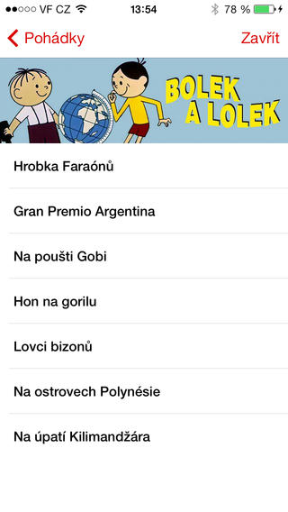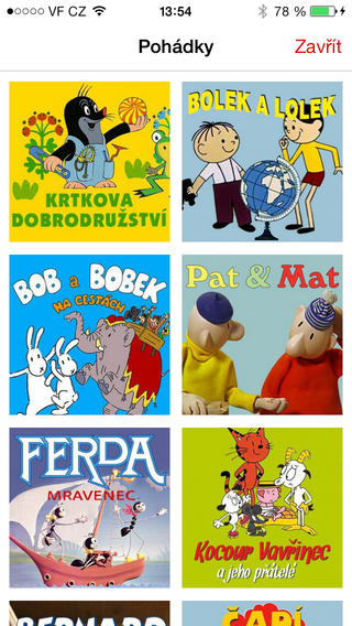 Znáte to: Konečně máte vše hotové a chcete strávit pár příjemných chvil s dětmi u příjemné pohádky. Zákon schválnosti ale velí, že právě v tu chvíli v televizi nic nedávají a nejbližší vhodný program začíná až v době, kdy musíte jít pryč nebo poslat děti do koupelny a postele. Nyní už se taková situace nestane. V aplikaci Pohádky naleznete 8 sérií „večerníčkových“ pohádek. Pohádkový obsah je každých čtrnáct dní obměňován tak, abyste se měli s dětmi stále na co těšit.