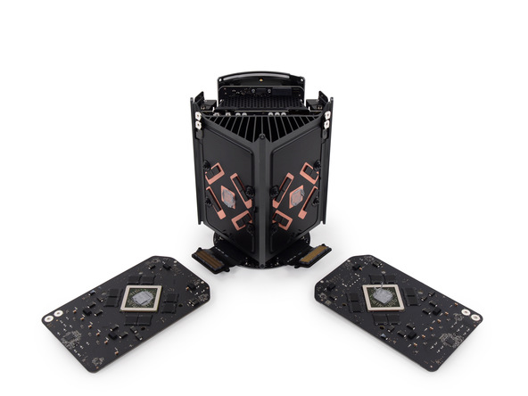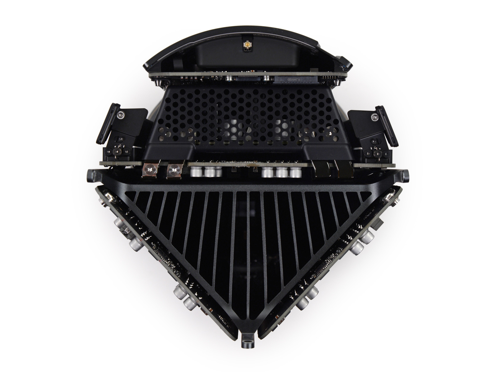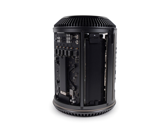 Na zadní straně Macu Pro je umístěno tlačtítko se symbolem zámku, kterým můžete odemknout celé zařízení, následovně sejmete horní válvový kryt z hliníku, poté budete mít přístup ke všem komponentům Macu Pro. Zajímavostí, na kterou iFixit přišel je, že dvojice grafických karet není identická, dále je velmi jednoduchá výměna a tím i rozšíření SSD disků nebo pamětí RAM pro člověka neorientujícího se v hardwaru.