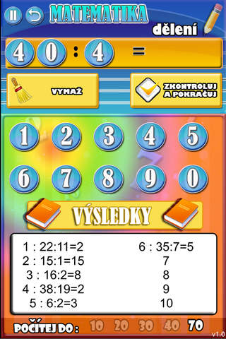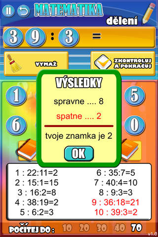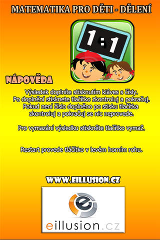 Po úspěšném startu v americkém appstoru jsme si pro Vás připravily českou verzi procvičování dělení pro školáky. Zjednodušte život svému malému školákovi i sobě a jednoduchým způsobem ho nechte vyzkoušet z dělení. Touto zábavnou formou mu to půjde daleko lépe a hlavně radostněji. Matematika dělení Vám nabízí zkoušení základního dělení a to do 10,20,30,40 a 70.