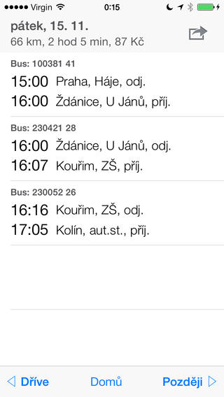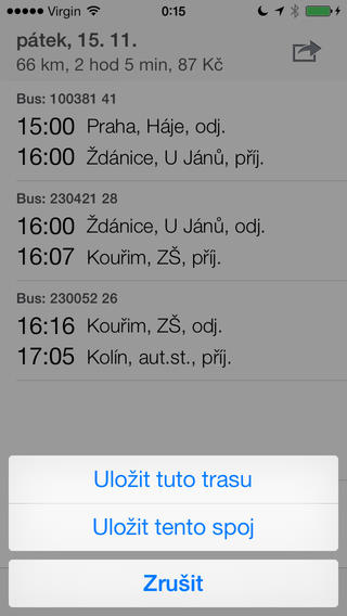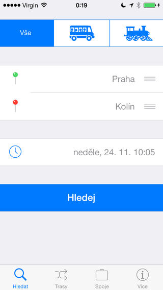 Prohledává veškerá města a vesnice, kde je dostupná veřejná doprava. Zobrazuje celkový čas cesty, přestupy, čísla autobusů i vlaků a cenu jízdného, pokud je k dispozici. Co aplikace umí: vyhledávat spojení meziměstské hromadné dopravy, zobrazit přestupy, celkovou vzdálenost, dobu cesty a cenu pokud je k dispozici, doplňování názvů při zadávání stanic, omezit hledání pouze na vlak nebo autobus, prohazování odkud/kam, ukládat spoje mezi oblíbené a GPS lokace.