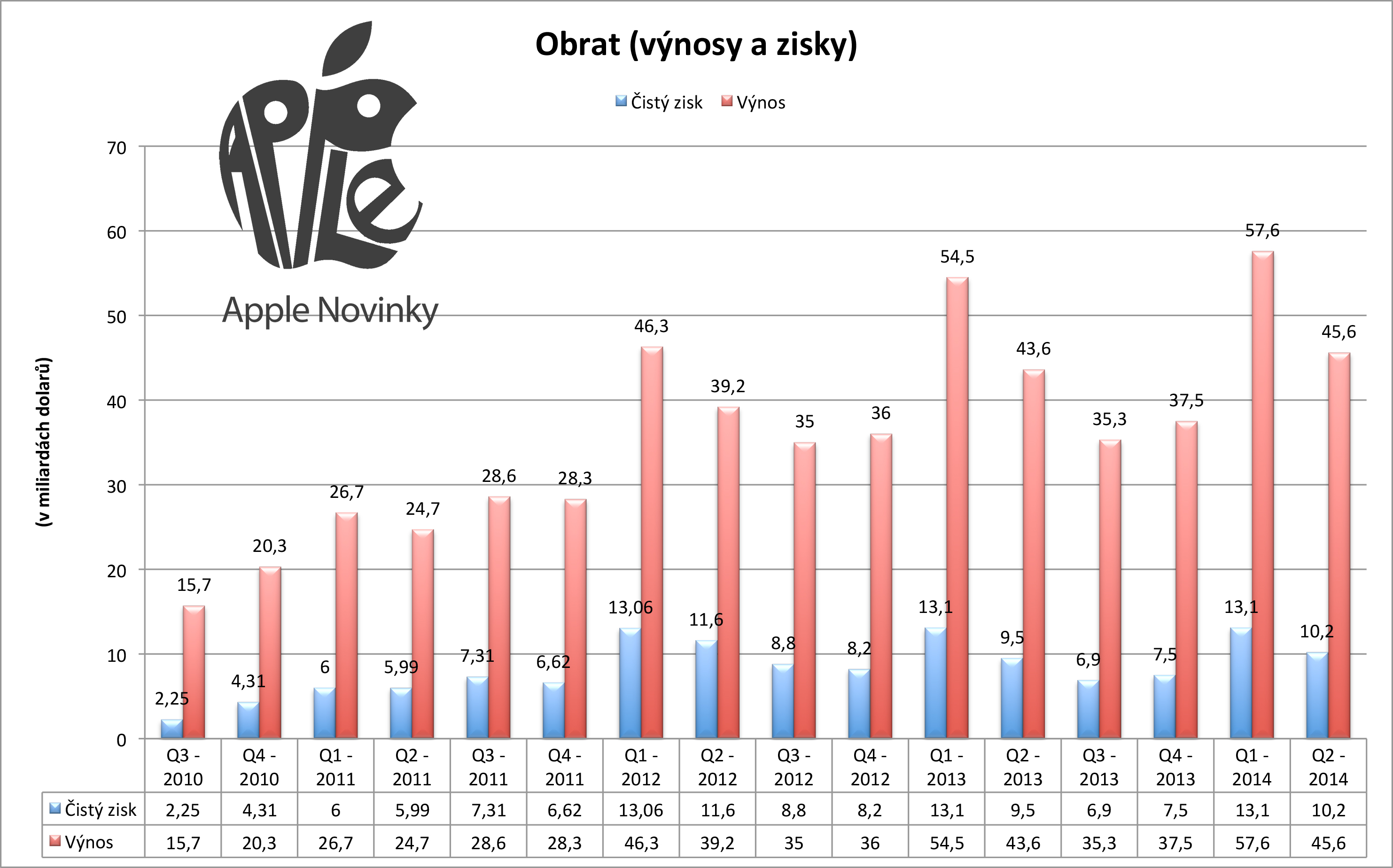 Apple dnes oznámil finanční výsledky za 2. fiskální čtvrtletí 2014. Výsledky za tento kvartál jsou vyšší než ty v roce 2013, v příštím roce však společnost očekává tržby ve výši 36 až 38 miliard dolarů. iPhone byl opět hlavním artiklem, iPad oproti tomu poklesl, výborně se dařilo naopak Macu a tradičně iPod neustále klesá.