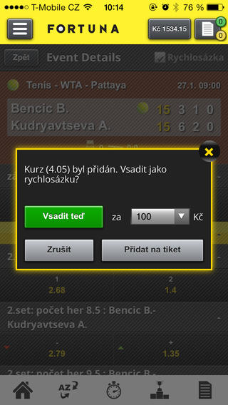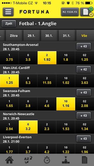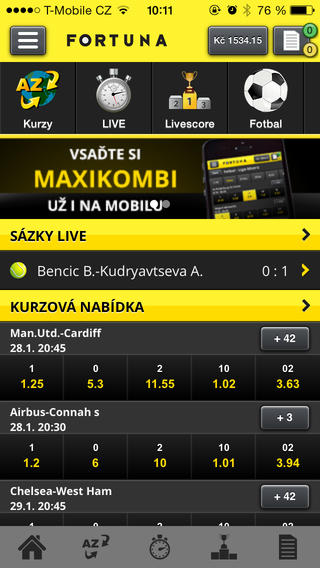 Sázková aplikace iFortuna.cz umožňuje sázet kdekoliv právě jste na všechny příležitosti, které máme v nabídce. Aplikace je zdarma pro nové i stávající zákazníky. Stačí se přihlásit Vašim uživatelským jménem a heslem. Vsaďte si před začátkem zápasu nebo LIVE v jeho průběhu!