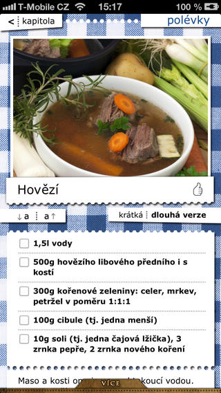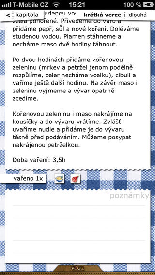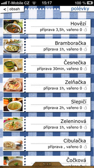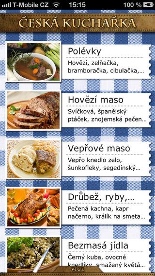 Aplikace obsahuje stovku báječných českých receptů, takových, jaké vařily naše mámy a babičky. Zahrnuje polévky, masová hlavní jídla, bezmasá hlavní jídla, moučníky, přílohy a několik vánočních receptů. Každý recept je navíc uveden ve dvou verzích: v jedné dlouhé (pro ty, kteří vaří recept poprvé nebo vaří poprvé vůbec) a v jedné krátké (pro ty, kteří si recept potřebují jenom připomenout).