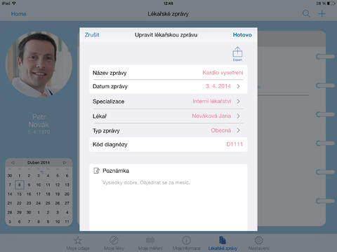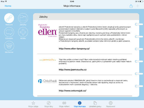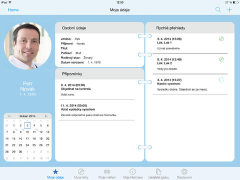 Deník pacienta je aplikace, která Vám konečně udělá pořádek ve svých zdravotních záznamech. Umožňuje evidovat celkový zdravotní strav, hlídat dávkování užívaných léků, upozornit na kontrolní prohlídky u lékařů, sledovat zdravotní záznamy k dané chorobě, archivovat fotokopie zdravotních výstupů k jednotlivým vyšetřením atd.