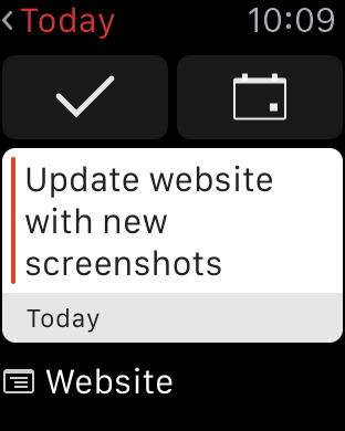 Aplikace ve verzi pro Apple Watch nabízí plnohodnotnou podporu všech funkcionalit hodinek, dokáže provádět úkony pomocí hlasového ovládání. Obsahuje přehled úkolů v současném dni, možnosti vyhledávat prostřednictvím filtrů a mnoho dalšího.