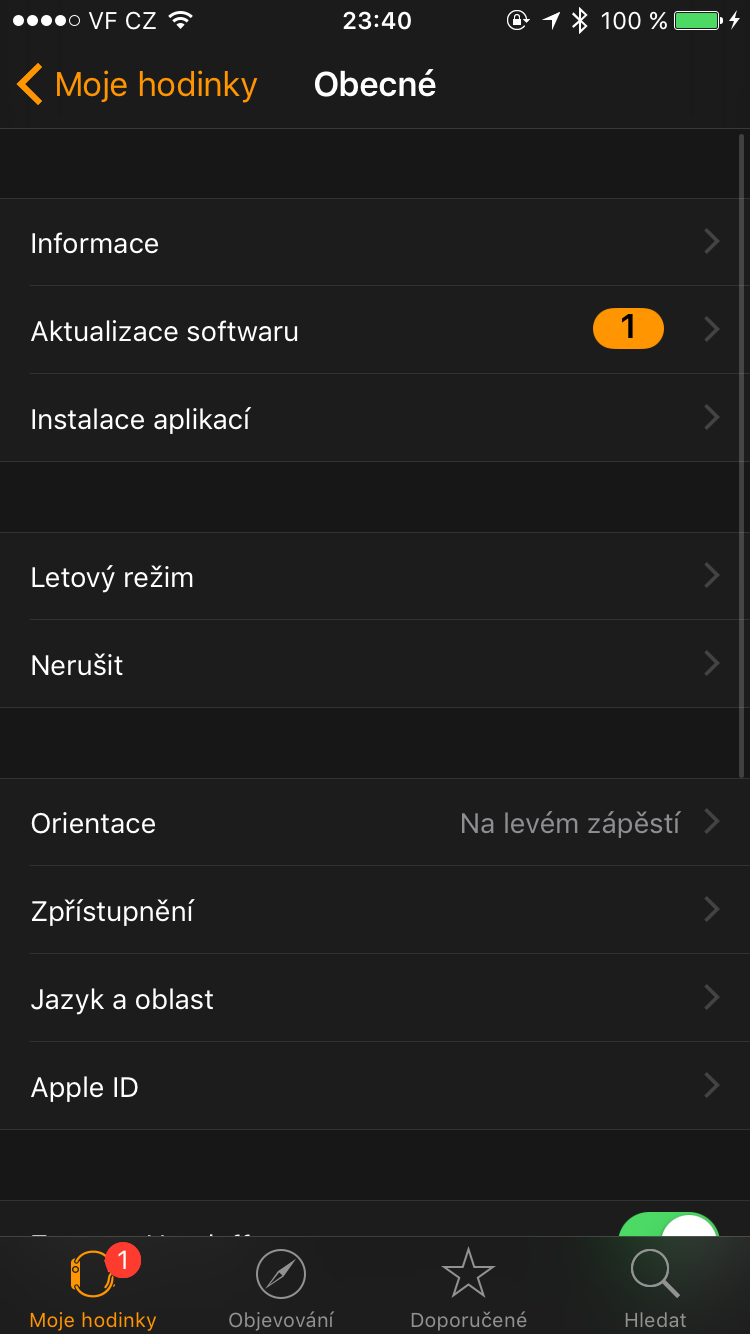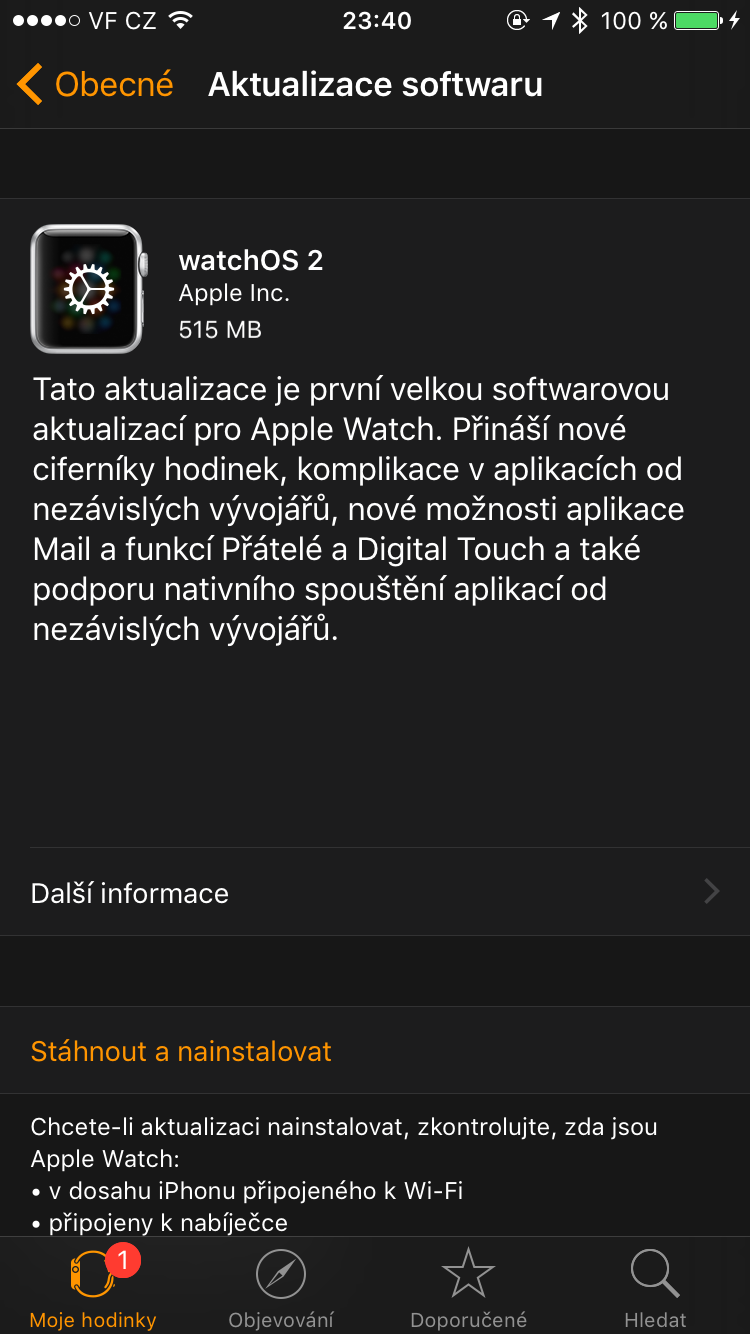 Důležité je mít Apple Watch nabité alespoň na 50%, stejně jako iPhone i přes to je nutné mít zapojené Apple Watch do nabíječky, jinak se vám nezobrazí na iPhonu možnost instalace. Ujistěte se, zda máte iPhone i Apple Watch připojený k Wi-Fi.