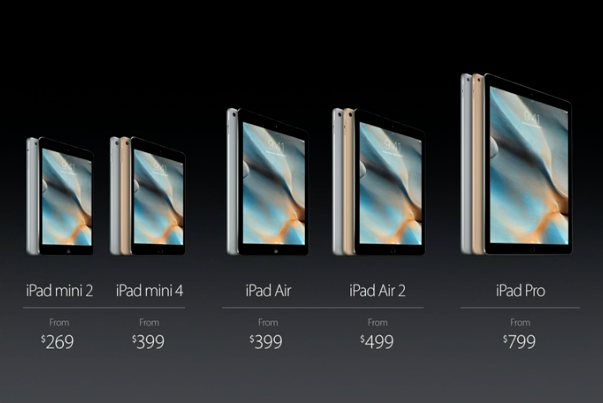 iPad mini 4 generace se začne prodávat od 399 dolarů. iPad mini 2 od 269 dolarů a iPad Air od 399 dolarů, iPad Air 2 od 499 dolarů.
