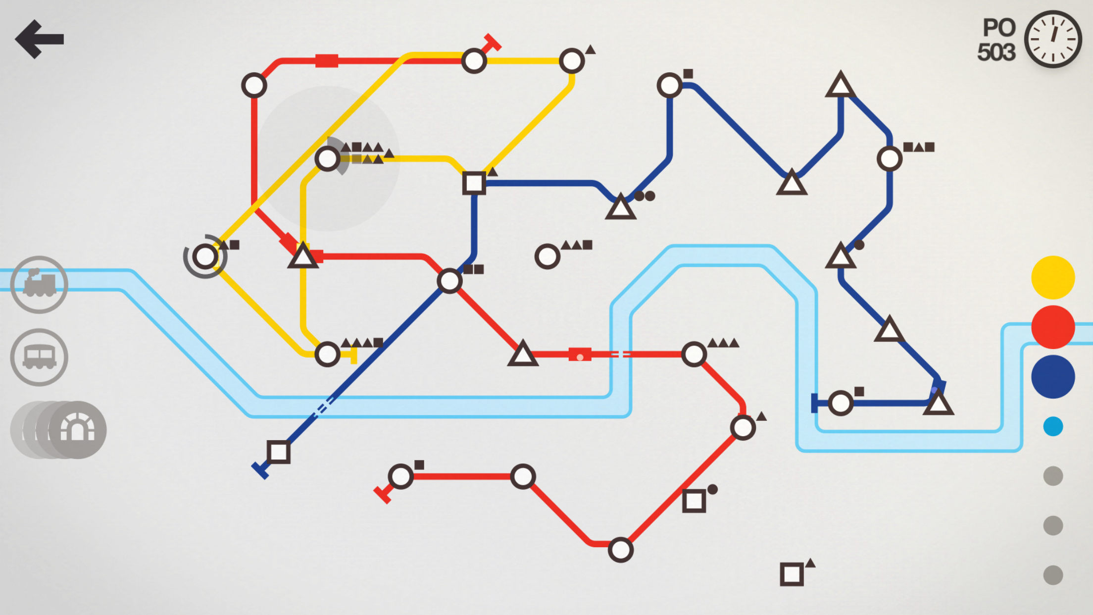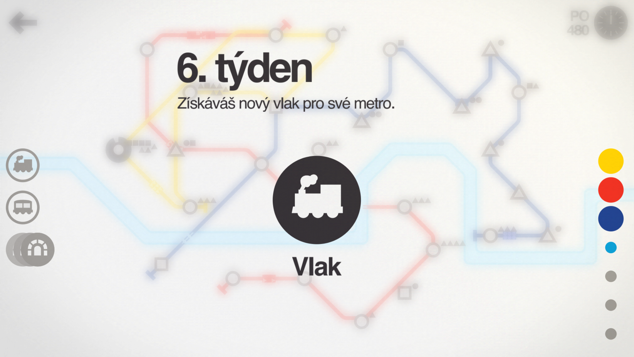 Z počátku určitě využijete funkci přetáčení času. Tato funkce, která se skrývá pod hodinami v pravém horním rohu, vám urychlí chod času. Chvíli to půjde, ale když přibude stanic, začnete spíše využívat zastavení hodin, které vám umožní snazší práci v podzemní síti.
