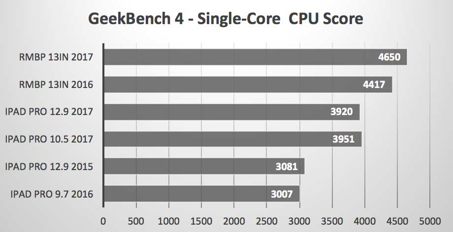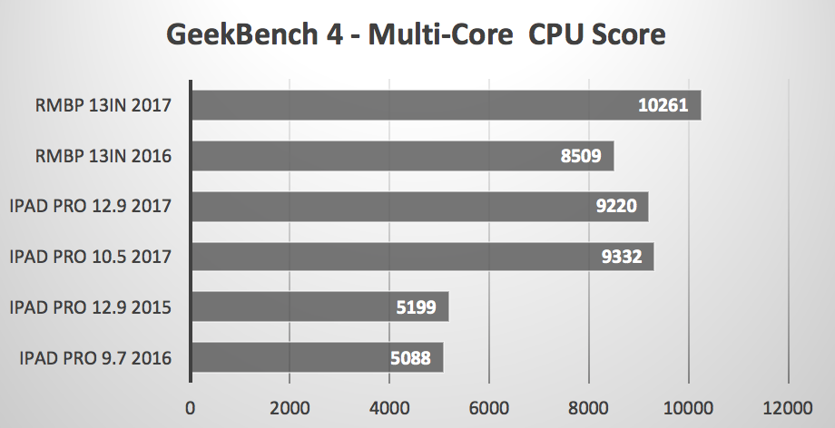 Na prvním místě byl MacBook Pro s rokem výroby 2017 se skórem 10.261. Na druhém místě 10,5″ iPad Pro, následně 12,9″ obě verze s rokem výroby 2017.