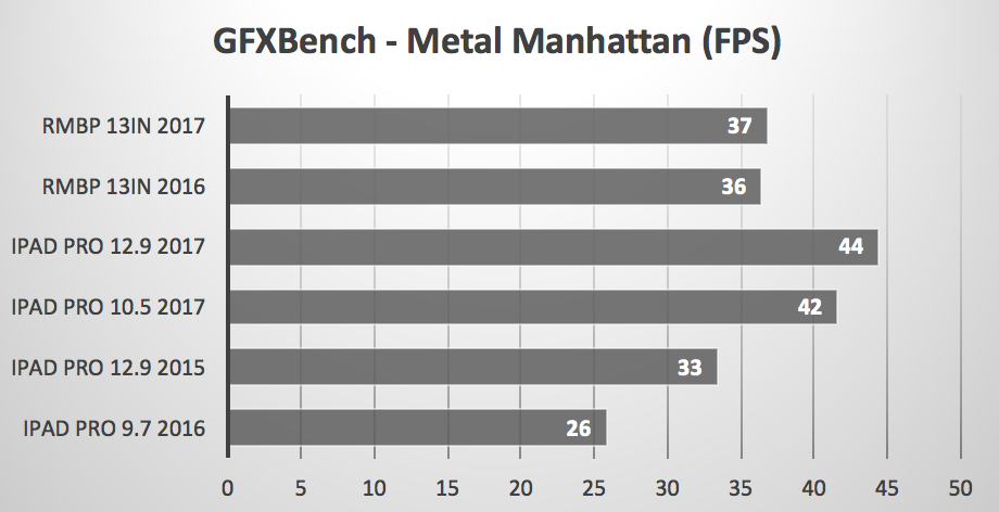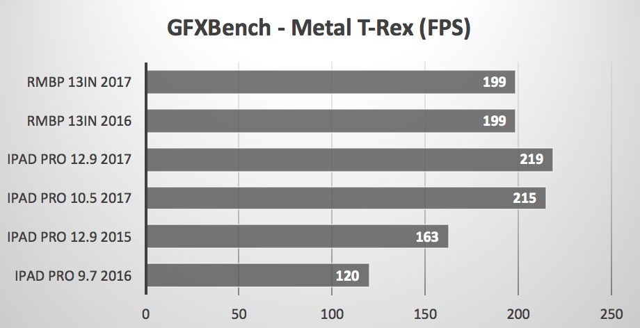 BareFeats udělal zajímavý test, kde dokonce u některých specifikací překonává iPad Pro výkonem i MacBook. Navíc můžete vidět i benchmarky MacBooků Pro s procesory Core i7 a 16 GB RAM. Testy byly provedeny přes GeekBench a GFXBench.