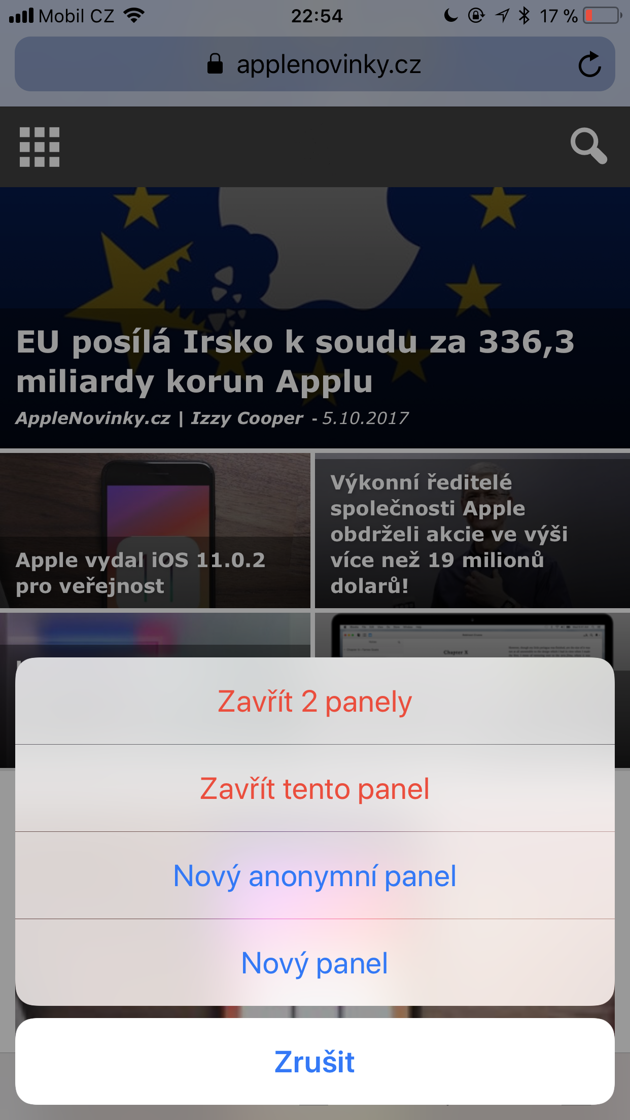 - Zavření všech oken prohlížeče: dlouhé přidržení ikonky tabů, následně zvolení možnosti zavření panelů
