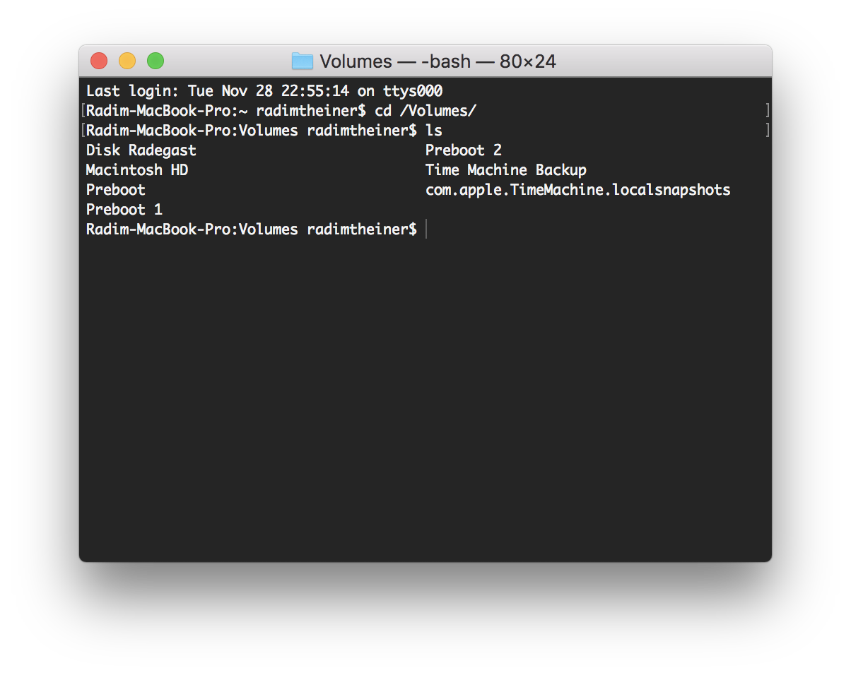 Nebo při psaní “mkdir /Volumes/“Název vašeho disku”/Backup” napište mkdir /Volumes/“První písmeno názvu vašeho disku a stiskněte TAB (to doplní název jednotky)”/Backup
