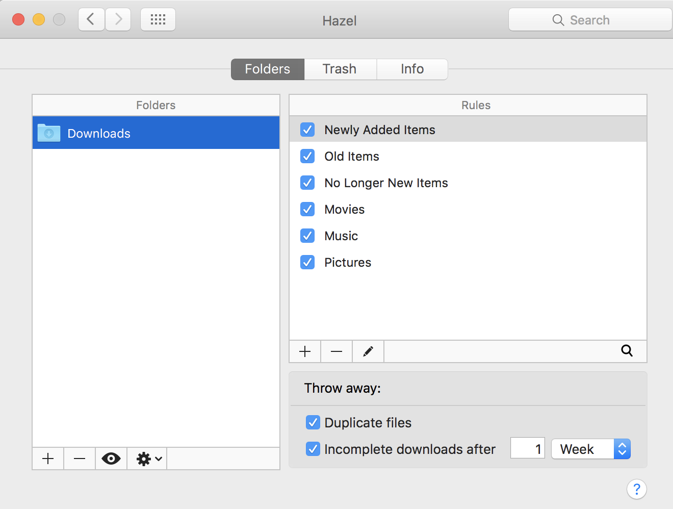 Aplikace, která je oproti ostatním doporučovaným podstatně dražší. Má ale unikátní funkce, které budete marně jinde hledat. Hazel automaticky slučuje a organizuje soubory ve vašem Macu. Nikdy si už nebudete, muset lámat hlavu s tím, že máte v Macu nepořádek. Aplikaci Hazel můžete svěřit třeba čištění stahovacího adrsáře nebo kteréhokoliv ručně vybraného. Hazel bude udržovat čistotu ve vaší složce a bude organizovat nově přibývající soubory. Filmy, obrázky, dokumenty… prostě vše.