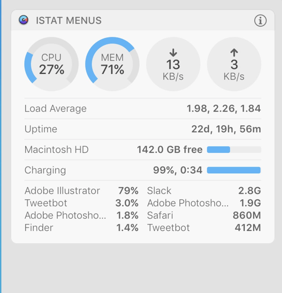 iStat Menus je aplikací placenou, velmi známou a stojící za svou cenu, pokud jste „šťourálkové“ a chcete vědět více o vašem Macu. Vše zjistíte pomocí status menu. Aplikace i Stat Menus do něj přidá věci jako je informace o využití procesoru, výdrž baterie, spotřeba dat, informace o paměti, počasí a mnoho dalšího. Pokud tedy chcete vědět více, než kolik ví běžný uživatel Macu, honem kupujte aplikaci iStat Menus.