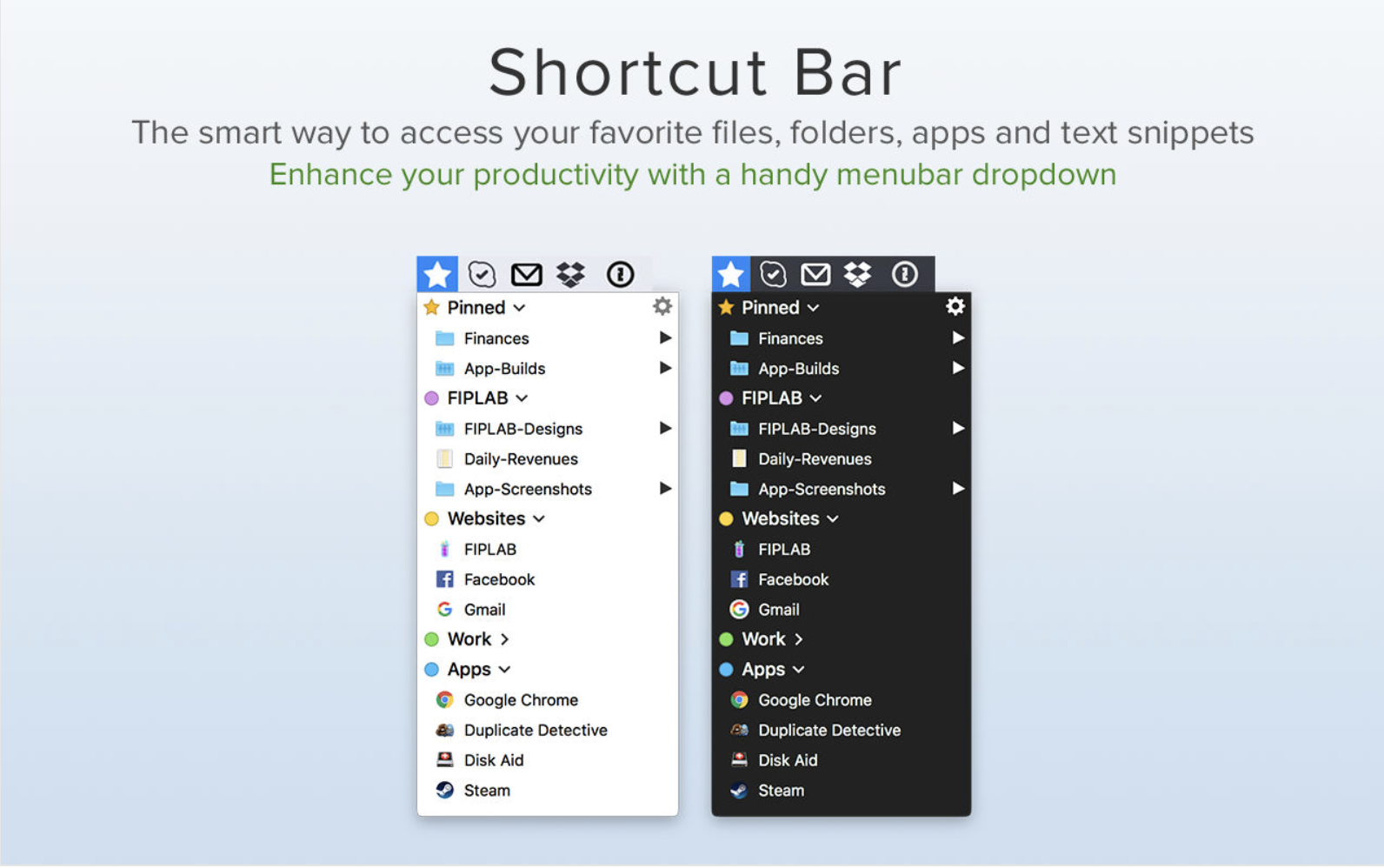 Jednoduchá aplikace, která vám umožní přistupovat k oblíbeným souborům a složnám z rychlého menu. Libovolné položky ve vašem Macu, složky, webové záložky, jednoduché poznámky a další soubory, ke kterým se dostanete pohodlně na jedno kliknutí.