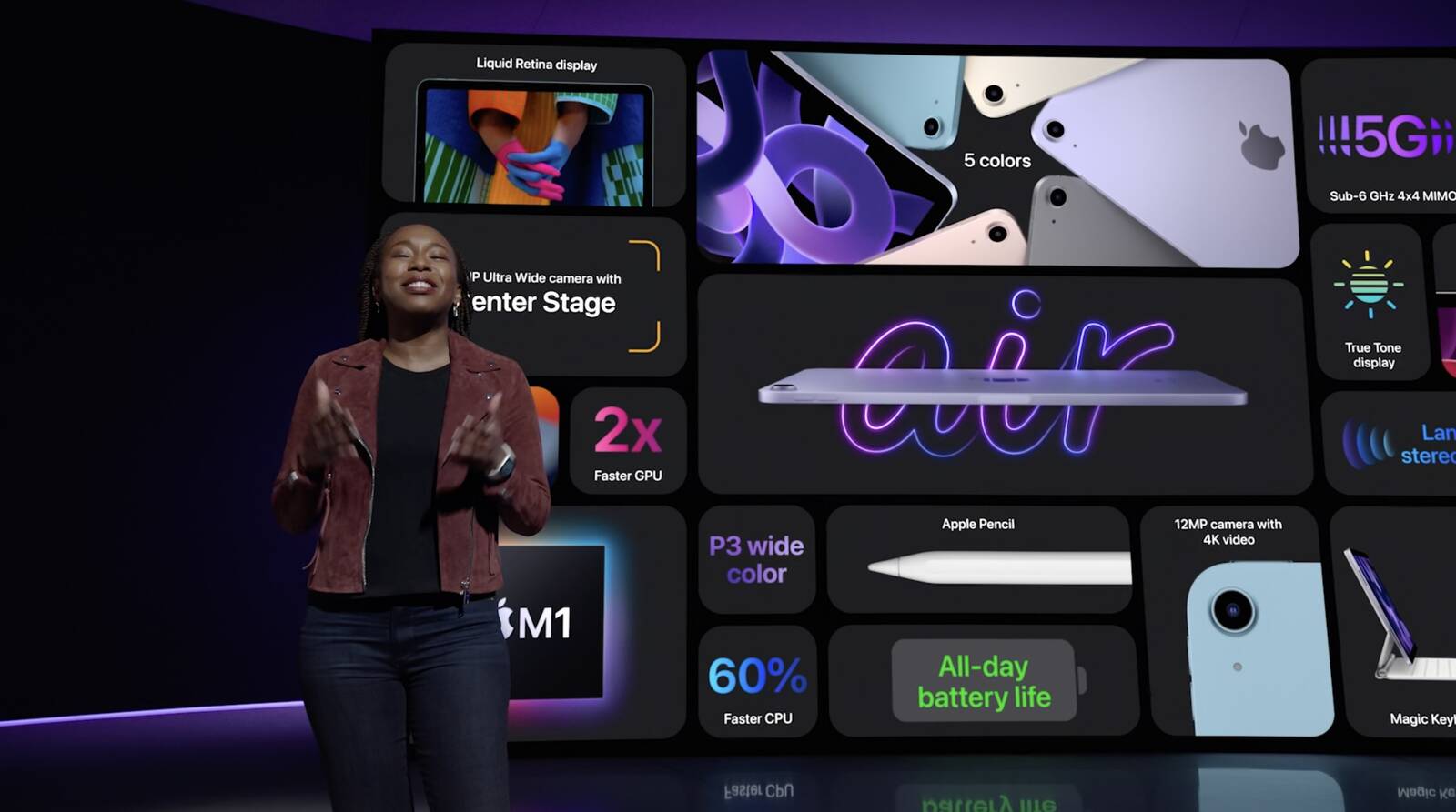 iPad Air obsahuje 10,9palcový Retina displej a je vyroben z 100% recyklovaného hliníku v krytu, cín v pájce na hlavní logické desce a prvky vzácných zemin v krytu a magnetech. Zařízení podporuje Apple Pencil druhé generace a 5G. Dále obsahuje 12MP Ultra Wide přední fotoaparát s podporou Center Stage, takže nyní všechny iPady, které Apple prodává podporují tuto funkci. iPad Air je rychlejší než nejrychlejší konkurenční tablet. A 2x rychlejší než nejprodávanější notebook se systémem Windows ve své cenové kategorii. Nový iPad Air 5 je k dispozici ve vesmírně šedé, růžové, fialové, bílé a zcela nové modré.