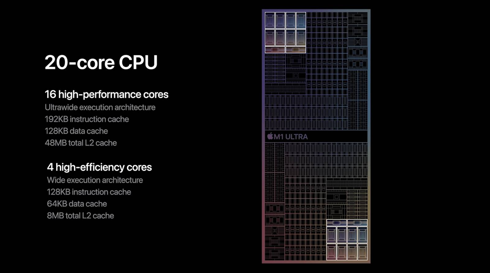 Tento 20jádrový čip nabízí 16 vysoce výkonných jader a 4 vysoce účinná jádra. S 32jádrovým Neural enginem dokáže provést 22 bilionů operací za sekundu. S 64jádrovým GPU nabízí osmkrát rychlejší výkon GPU ve srovnání s čipem M1 představeným v roce 2020. Nabízí hardwarově akcelerovanou podporu H.264 HEVC, ProRes a ProRes RAW se 2 moduly pro dekódování videa, 4 moduly pro kódování videa a 4 moduly pro kódování/dekódování ProRes.