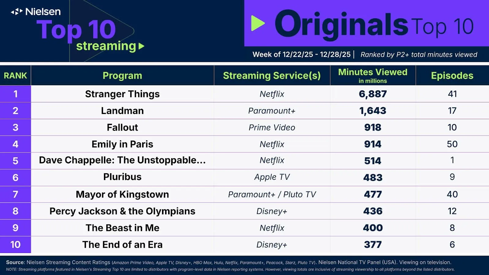Mezi 22. a 28. prosincem nasbíral Pluribus ve Spojených státech celkem 483 milionů minut sledování. Oproti předchozímu týdnu jde o nárůst o 40 %, což seriálu zajistilo 6. místo v žebříčku Nielsen Top 10 Originals. Pro srovnání – v týdnu 8.–14. prosince se Pluribus umístil na 9. příčce s celkovým časem 360 milionů minut sledování. Trend je tedy jasný: s blížícím se finále zájem diváků výrazně rostl. Na čele žebříčku se podle očekávání umístil Stranger Things, který ovládl jak kategorii Originals, tak celkové hodnocení. Seriál dosáhl ohromujících 6 887 milionů minut sledování, což bylo dáno především vydáním páté, šesté a sedmé kapitoly finální série ve dnech 25. a 26. prosince.