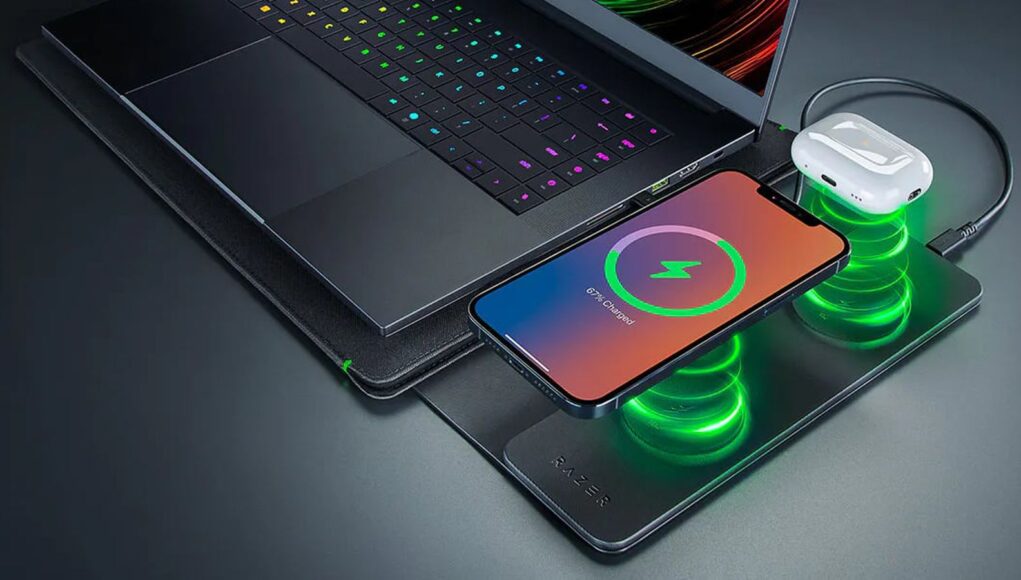 Společnost Razer představila nové pouzdro na 16palcový notebook s integrovanou funkcí bezdrátového nabíjení pro chytré telefony a další malá zařízení, jako jsou sluchátka. Pouzdro obsahuje dvě bezdrátové nabíjecí zóny kompatibilní s MagSafe, takže umožňuje současně nabíjet iPhone a AirPods.