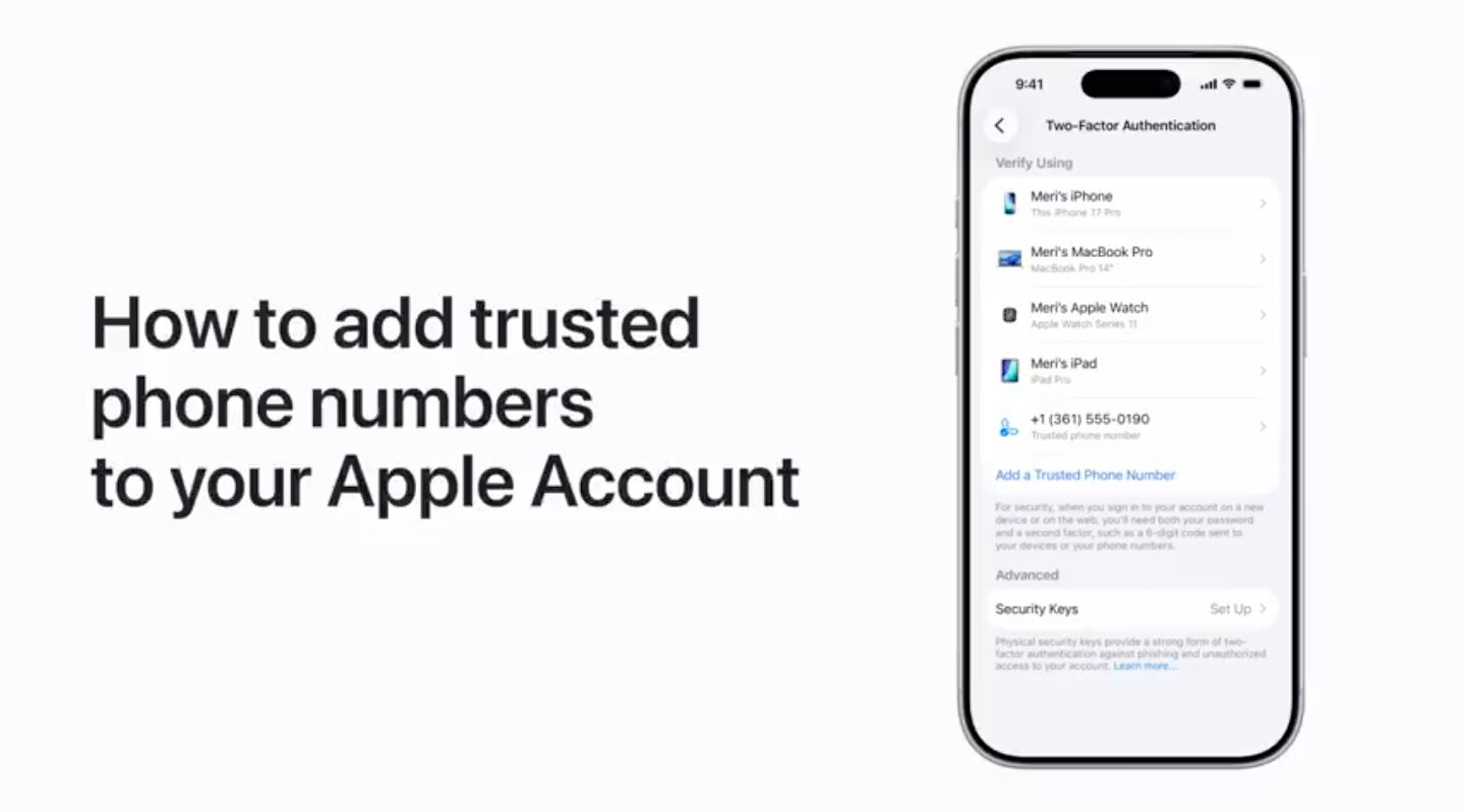 Přidejte další důvěryhodná telefonní čísla, na která budete moci dostávat ověřovací kódy pro přihlášení k účtu Apple, v případě, že nemáte přístup k důvěryhodnému zařízení a primárnímu důvěryhodnému telefonnímu číslu.